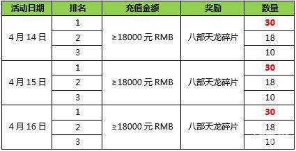【天龙3D】于4月13日-16日开启了大区排行榜活动,活动奖励主要放出超级玉辉石、红色-九色神鹿、红色-七杀命格、高级橙色精魄等。大区排行榜将额外开启八部天龙限时特惠活动,详细规则如下:活动服务器:IOS互通服/腾讯服/UC服/体验服(分别统计榜单)活动时间:4月13日-16日活动规则:活动期间内,每日充值金额满足要求,且充值排名前3的玩家,将获得“八部天龙碎片“奖励: