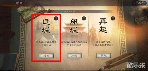 3、君主选项中我们就可以看到对城池的操作选项,分别是迁城、闭城和再起。点击其中的迁城并选择目标区域即可完成迁城。