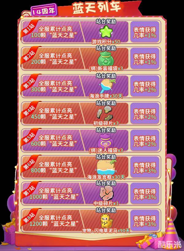 蓝天列车:活动期间累计充值108金币即可解锁,并点亮1颗“蓝天之星”,根据全服“蓝天之星”的点亮数量,解锁奖励。