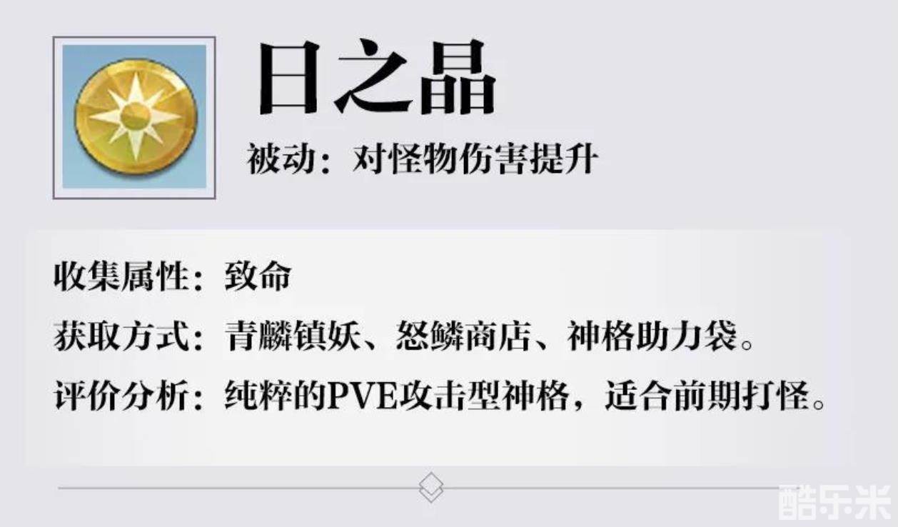 pve的神格则推荐蓝色神格日之晶,它可以提升对怪物的伤害值超过1.6%。