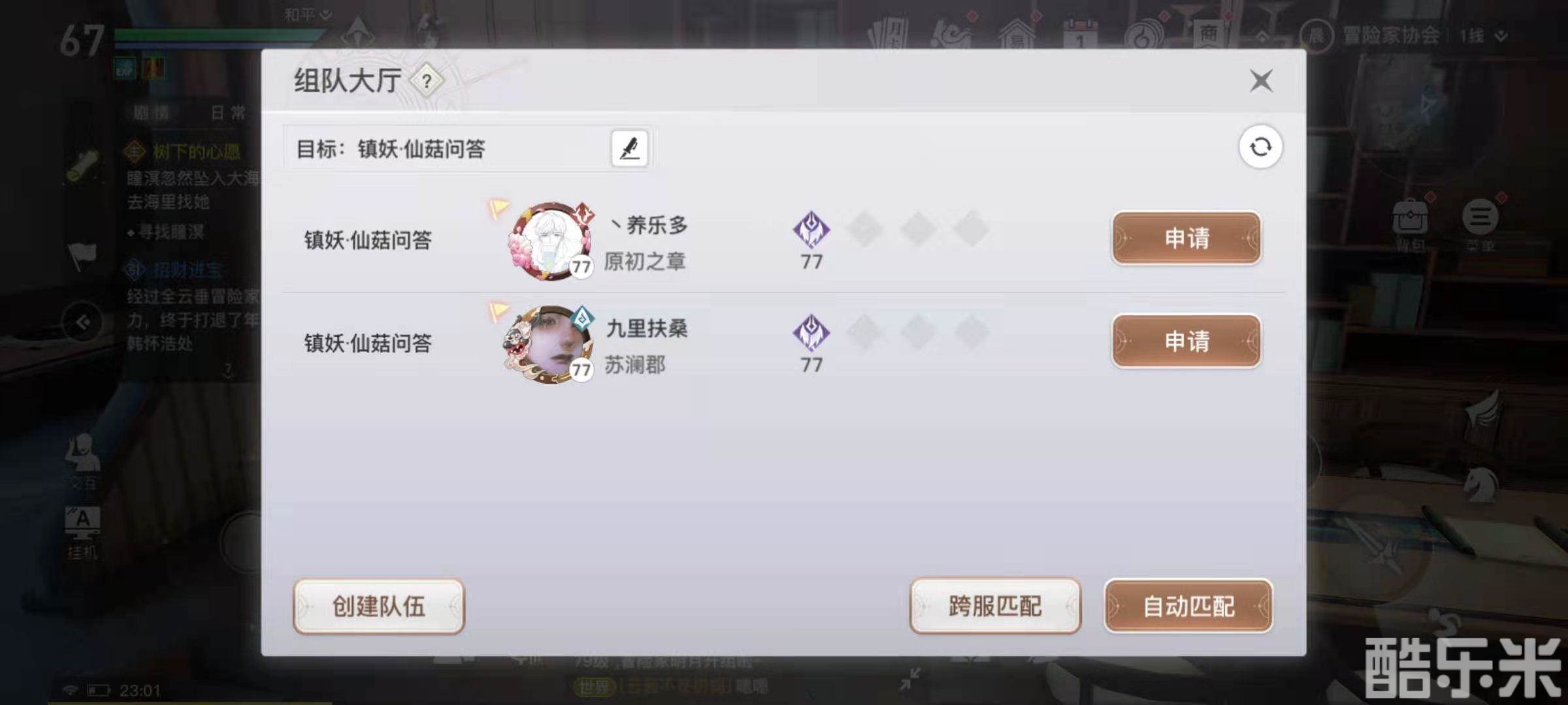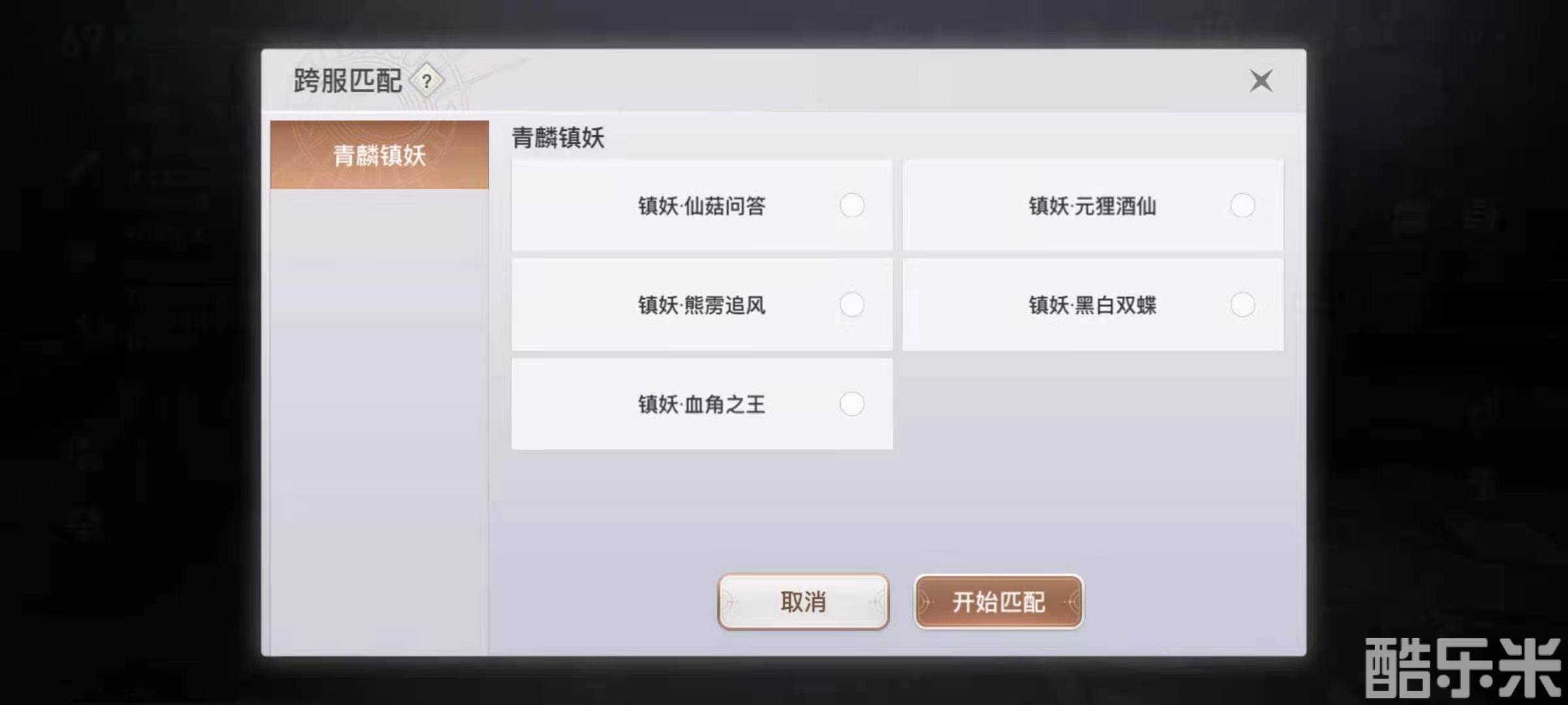 在活动日程中找到青麟镇妖活动,点击组队参加按键就可以切换到组队大厅的界面了,在组队界面的下方有自动匹配和跨服匹配两个选项,点击跨服匹配,选择好想要挑战的镇妖关卡就可以开始跨服组队一起挑战了。