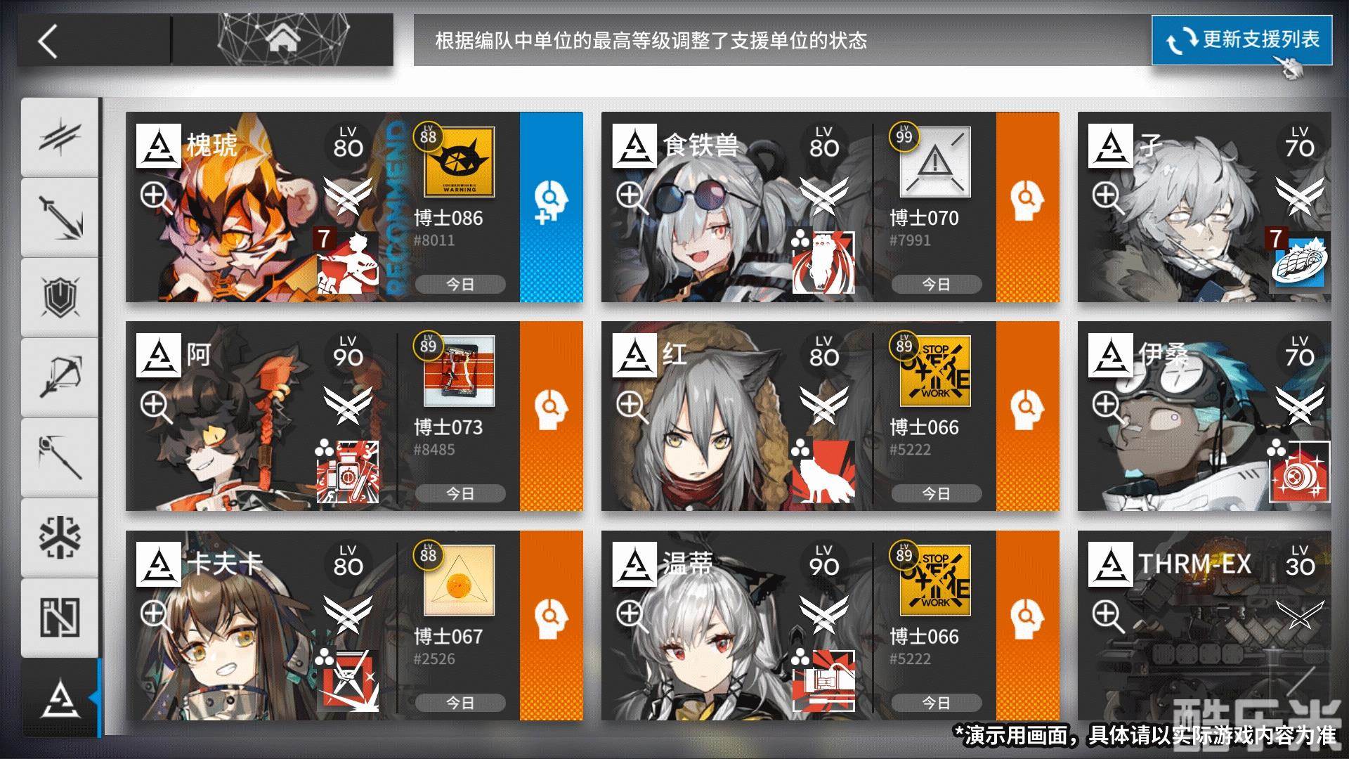 新的助战系统将通过干员所属职业来划分助战干员,助战干员会出现在与该干员相对应的职业列表中,每次刷新后每种职业将至多存在9位助战干员。