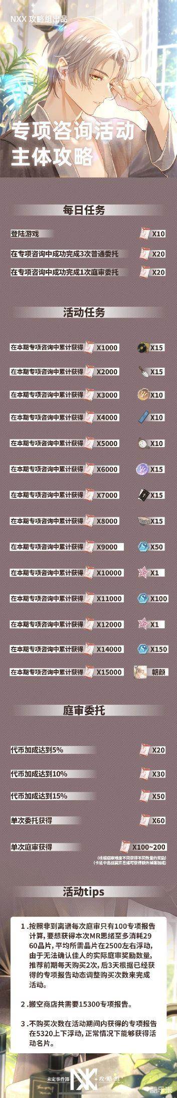 一般在这里都有一个任务进程的存在,我们可以通过在其中查看专项咨询的庭审委托获得代币加成效果达到10%。如果后续大家继续完成这一庭审委托,可以将代币加成的效果提升到15%。整个活动过程中,我们只要使用莫弈卡,一次就能够将全部奖励拿到。粗略计算了一下每天可以增加每日任务370,如果不加每日任务就有320,而15000则需要使用水晶币续上31次才能获得,相当于一共有80次,一共有2480。大家在去掉任务奖励300之。