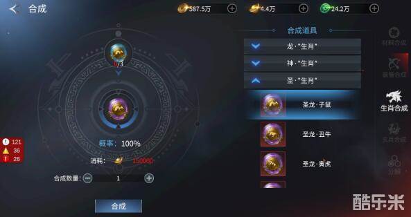 游戏中生肖合成的方法还是非常简单的,游戏中的生肖分为三个种类,包含龙、神、圣三种,大家需要用很多的低阶生肖道具来合成出高的生肖道具,一般都是三个三个来进行合成,后期能入手很多的生肖道具,我们可以多合成提升自己的战力哦。