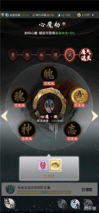 心魔劫:五个心魔需要完成各任务激活足够的点数来炼化激活,激活会获得对应属性增幅以及奖励。