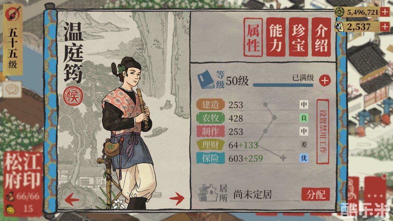 初始属性:建造50,农牧71,制作50,理财15,探险256