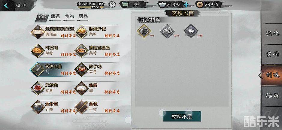 游戏里还有生产系统,进入生产界面,可以看到我收集的配方,点击配方就可以看到需要的材料清单,这里也会需要相应的材料来进行生产: