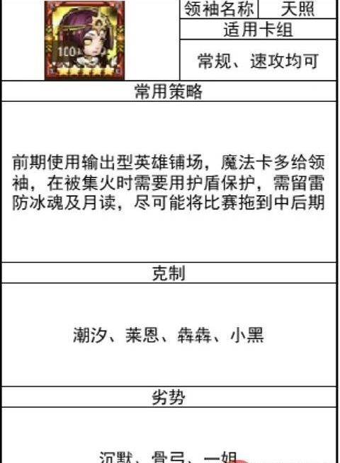 5、天照,对于己方英雄的辅助非常强力,并且开大具有出色的压制能力,缺陷就在于本身过度依赖大招,致使禁疗、控能、反伤都会对天照造成巨大威胁,需要留魔法卡保护