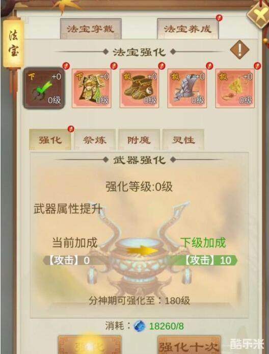 强化主要强化法宝的主要属性(一条),比如说武器就强化攻击、鞋子就强化闪避等等;