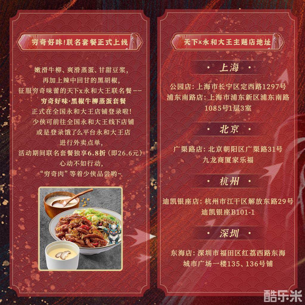 了解完此次惊喜福利,少侠们是否已经蠢蠢欲动?在与穷奇酣战的同时,各位少侠别忘了来永和大王线下主题店打卡,与“霸总”穷奇现世相约哦!
