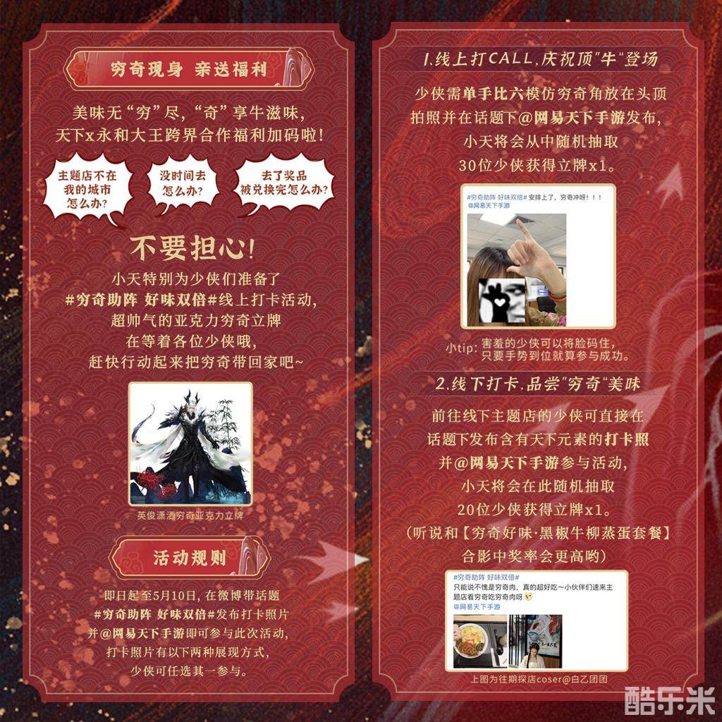 享用美味的联名套餐后,#穷奇助阵 好味双倍# 微博活动也已开启。各位少侠可选择线上线下两种打卡方式,前去永和大王主题店的少侠带话题发布含天下元素的照片,并@网易天下手游 即可参与活动;线上的少侠只需单手比六模仿穷奇角放在头顶拍照,并在微博话题下发布即可,参与打卡即有机会赢取穷奇亚克力立牌!