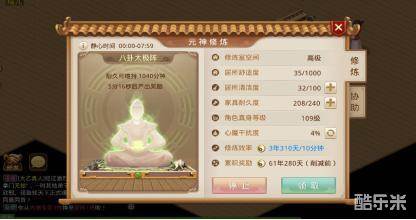 第四,重点说下关于居所的一些养成玩法。主要注重于75级之后要立刻买一个居所,然后把八卦图放在居所里面提供人物修炼,每天也会给不菲的道行。然后同样很重要的是,居所材料收集任务必须要及时做,你优先将种地等级提升到六级,就能比别人更早做出来观音像,观音像能提升八卦阵的修炼效果。但每个观音像给的加成效果数值是随机的,有一定实力的玩家建议选择10%以上的,开出低于10%效果的观音像的话还是丢了吧...