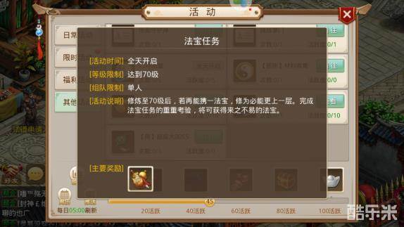 玩家等级达到70级就可以每天获取一个法宝,获取法宝可以单人也可以组队前往。若当日未完成获取法宝,任务也不会重置。若任务未完成放弃任务,则需要重新领取和提交相关首饰。道友们需要前往天墉城逍遥仙处领取法宝任务,逍遥仙说要想获得法宝,需要龙王的指点。
