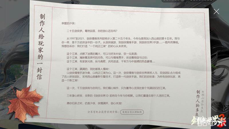 今日,西山居悬念站正式迎来揭秘,这款“新剑侠情缘手游”正是由西山居原班人马潜心打造,开创经典国风江湖大世界的《剑侠世界3》,其中《剑侠世界3》手游制作人孙多良在悬念站上发布了对玩家的一封信。