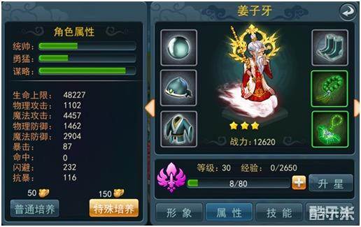 加入实战之前还是要先给【姜子牙】准备一下的。毕竟裸体上阵也是灰常不雅观的。级别升到当前的最高等级这个是必然的。然后进入【铁匠铺】为你的姜子牙至少将【装备】升级到【绿色】。这里要注意的是,如果你的铜钱和石头都不足够,那么小编建议你把姜子牙比较弱的生命和防御先升起来,弥补他的短处。