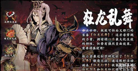 一套10件套的套装,在将龙家至尊套装进化至60级后,可以使用进化锻造,并利用一组特殊的“狂化气息”,“狂龙印记”材料,将龙家至尊.极套装“污染”为这套受到诅咒的邪恶套装,拥有极致恐怖的威力,但是有着对生存能力造成巨大挑战的负面效果,且不像罪体装备那样可以洗去。同时需要注意的是,狂龙乱舞与龙家至尊/龙家之傲的所有部位都互斥,无法同时装备。