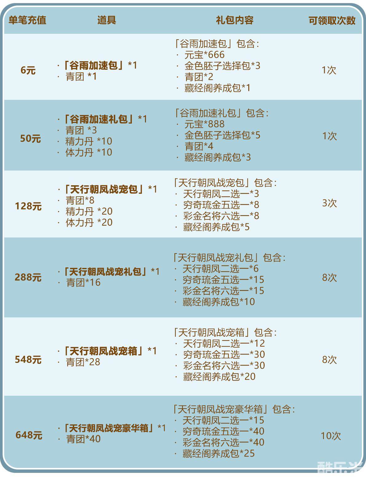 在活动期间少年们单笔充值至指定金额,即可获得天行朝凤二选一、穷奇琉金五选一、彩金名将六选一、藏经阁养成包、青团等资源:
