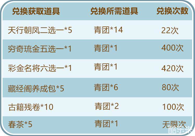 2.「青团」、「春茶」可以兑换各种高级稀有资源,详情请登录游戏查看。
