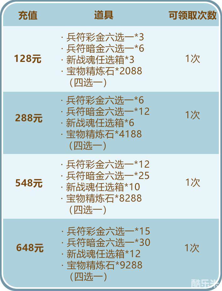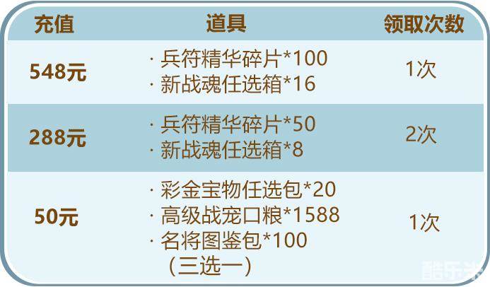 少年们单笔充值指定金额,即可得到兵符精华碎片、新战魂任选箱等珍稀资源,少年们千万不要错过哟~