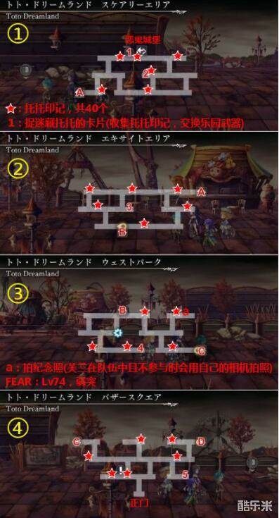 ①收集40个托托印记(★处),在1处交换乐园武器(杖剑刀斧枪弓拳锤,各1),可强化。