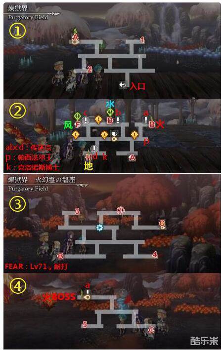 流程:入口→A→(完成下图4个支线获得道具)→和地水火风4个精灵战斗(※不使用支线道具难度较大)
