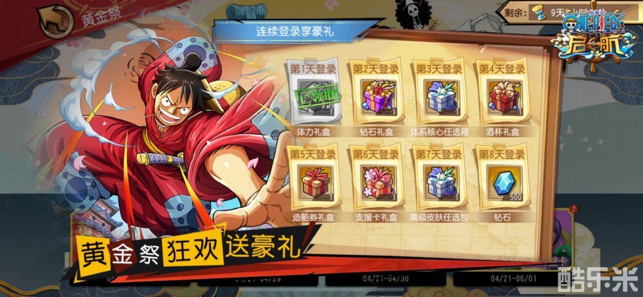 本次黄金祭连登活动截止时间为4月30日23:59,每日进入黄金祭连登页面可领取体力、钻石、酒杯、造船券、支援卡等礼盒,第3日登录可获得体系核心任选箱,可选择黄猿、雷利、甚平、强智、马尔高、情人节·佩罗娜角色碎片*10其中一种;第7日登录可获得高级皮肤任选包,可选择新世界·路飞、新世界·佐罗、新世界·奈美、新世界·山智其中一个限定皮肤。船长们可根据自己情况选择心仪的碎片及皮肤,只需登录8天就可在五一假期之前领取到全部连登奖励。