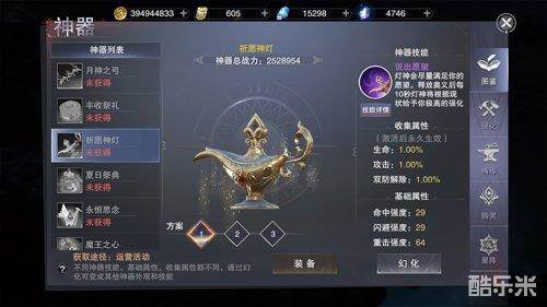 祈愿神灯:奥义技能冷却每减少10秒,获得一个增益效果,该效果包括恢复3%最大生命值、30%PVP增伤、5秒霸体、造成相当于900%奥义技能的伤害。祈愿神灯赋予的效果并不是特别霸道,但拥有【意念链接】天赋加持的圣女,每使用一个普通技能,就减少4秒奥义冷却,可以很频繁的触发神器效果,光想想就知道有多强力。
