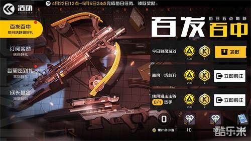 4月22日12点-5月5日24点,活动期间完成对应的活动任务可以获得命中值,累积一定数量的命中值可兑换活动奖励:钻石、熟练度加速卡,你是否是王牌神枪手呢呢?那就试一试吧!