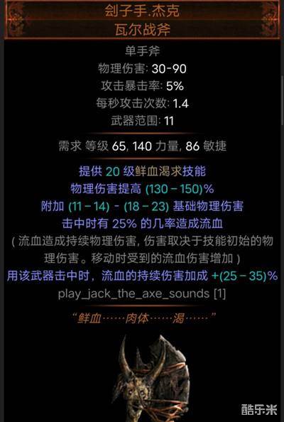 首先是dps方面,这把武器的大伤比传统的流血裂界斧子高了接近1/3,鲜血渴求提供了20more物理伤,自身又有35物理持续加成,在伤害上并不是很输于以前的黄斧头。