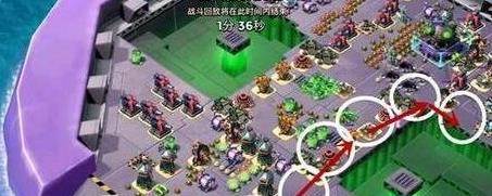 1、第一波不出兵,主要是清理地图上的地雷和防御,小红圈处的三个火箭发射器要全部炸掉,基地下方的震爆地雷利用机械小怪全部引爆。后方的地雷也用多管清理下。