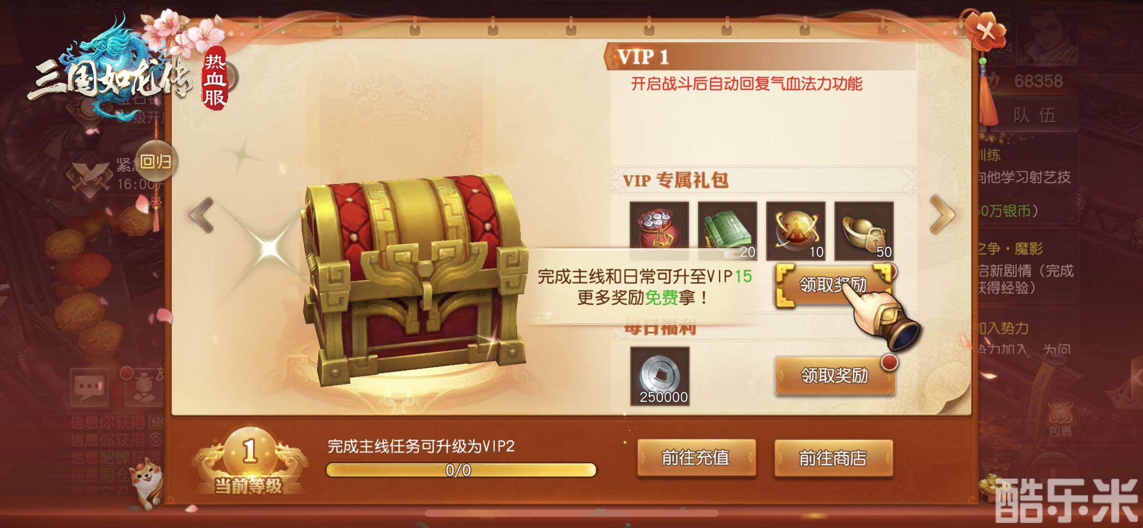登陆即送VIP5, 20项VIP特权等你享用,包括金色宝物和氏璧、高级神佑在内的1500元大礼包免费拿。参与玩法可将VIP等级免费提升至15级,免费领取神将魂魄、赤兔马、专属外观,更可获得价值10000元的VIP奖励和60项VIP特权!