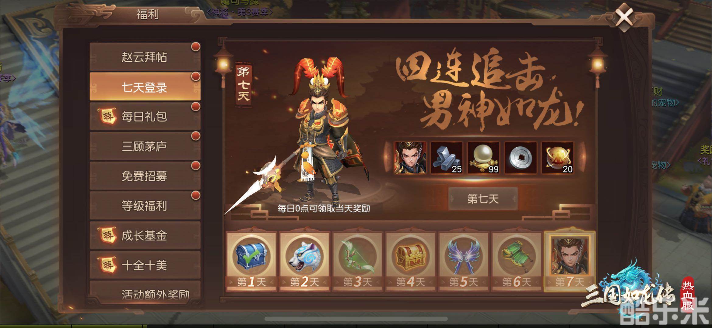 更有次日登陆,超强天将马超免费拿;三日登陆,萌系跟宠旺财跟回家;登陆七天和十四天,更可获得金色宝物和氏璧和大量神将魂魄!