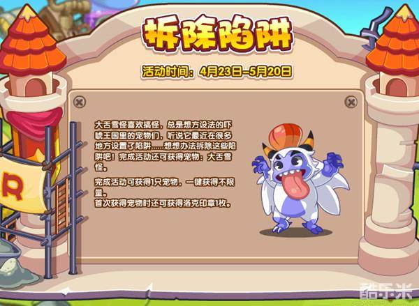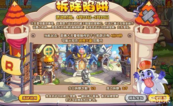大舌雪怪喜欢搞怪,总在想方设法的吓唬王国里的宠物们,听说它最近在很多地方设置了陷阱……想想办法拆除这些陷阱吧!完成活动还可获得宠物:大舌雪怪。