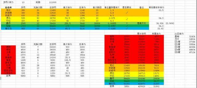 1.素材部分,“是否更优”是与素材十对比,“等效素材本体力”意为获取一次素材十掉落材料所需体力。