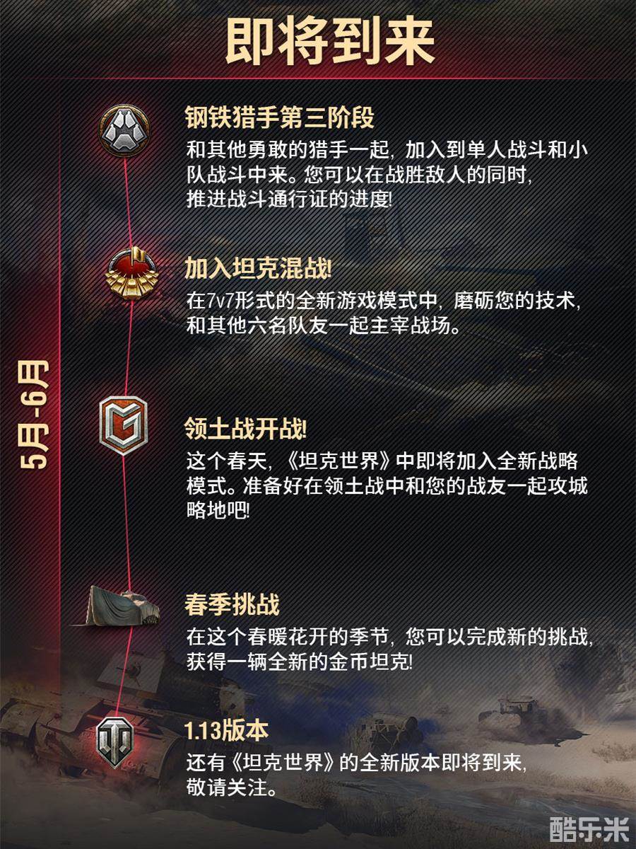 随着1.12.1版本的到来,您还将在之后邂逅“7V7坦克混战”、“领土战”、“春季挑战”等众多趣味活动,狂斩更多豪礼,让我们来期待一下!