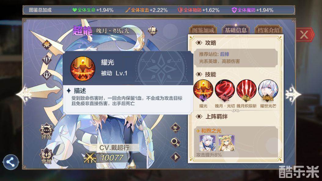 看上去可以作为光队出现的角色,英雄技是达到3只光加5%的生命,4只光再加3%伤害。