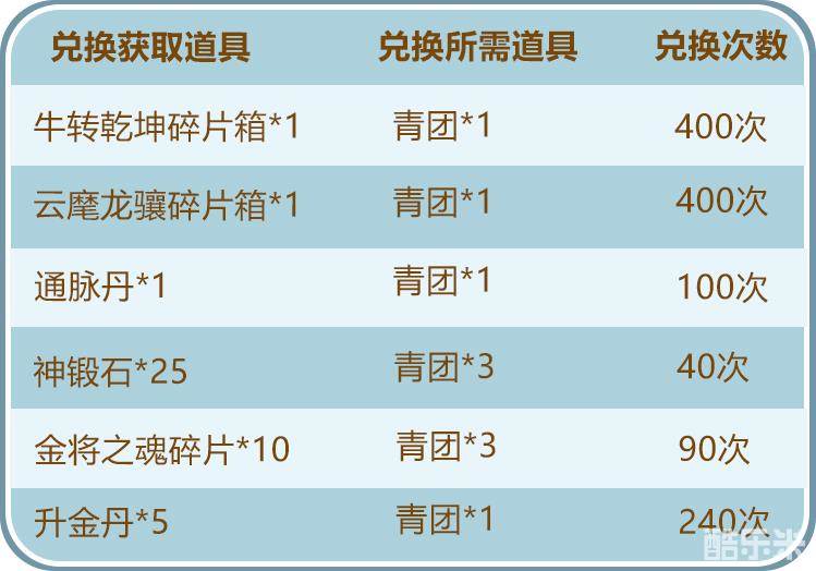 「青团」可用来兑换牛转乾坤碎片箱、云麾龙骧碎片箱等稀有资源: