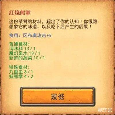 烹饪菜品红烧熊掌需要的食材包括了调味料、魔幻泉水、新鲜的蔬菜、九香虫、妖熊掌