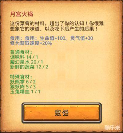 烹饪菜品月宫火锅需要的食材包括了调味料、魔幻泉水、新鲜的蔬菜、妖熊掌、狼妖肉、玉兔精血。