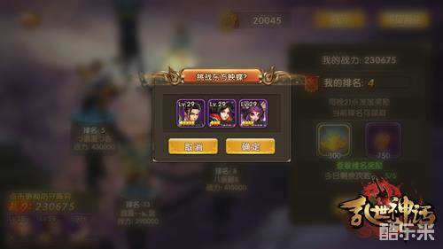 在屏幕正中,你可以看到与你名次接近的主公正虎视眈眈看着你,摆着异常嚣张的POSS,看着就很脚痒对不对?恨不得把他们一腿扫下来。当然如果眼前这些主公都不如你,或者有那种你希望下次再与他较量的人,也可以选择换一批。