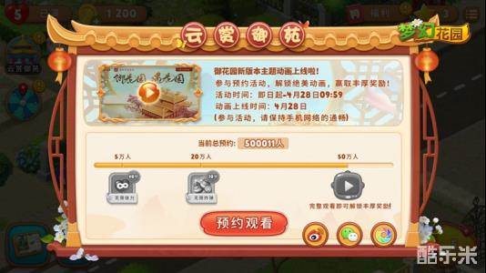 同时,《梦幻花园》的全新活动“云赏御苑”也在今天同步上线,这次的活动是关于动画的解锁活动,只要参与本次主题动画的预约,就能够解锁游戏的精彩福利,预约达到50W人,还可以提前解锁绝美动画!