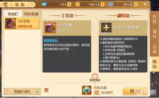 装备熔铸,是使用副装备熔铸进主装备,装备必须是同部位同等级装备。装备熔铸时会对装备的特效进行转移。
