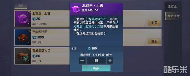 《妄想山海》中可以通过在北冥纪中的商店使用“北冥玉”兑换“北冥玉·上古”,其中20个“北冥玉”可以兑换1个“北冥玉·上古”,而“北冥玉”可以通过在纪元活动中完成各种各样的任务后获得。