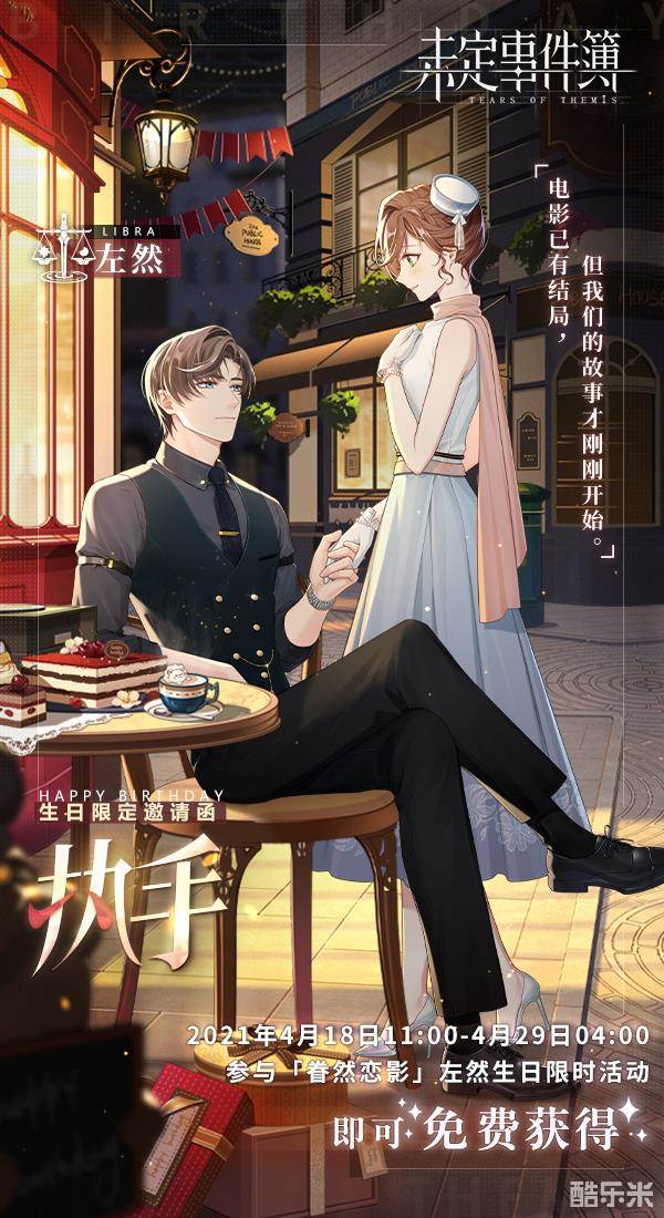 甜蜜眷恋,对影成双。今天,是《未定事件簿》男主之一左然的生日。近期,《未定事件簿》开启了「眷然恋影」主题生日活动,为左然庆生。游戏内,「眷然恋影」活动限时开放,玩家四处寻访电影节观众,努力为左然复刻还原令人心动的电影场景;游戏外,《未定事件簿》借左然身为高级律师的职业身份,联合中国法律援助基金会开启「毅然同行:法律援助」联合公益活动,共同呼吁关注法治建设,共创美好生活。