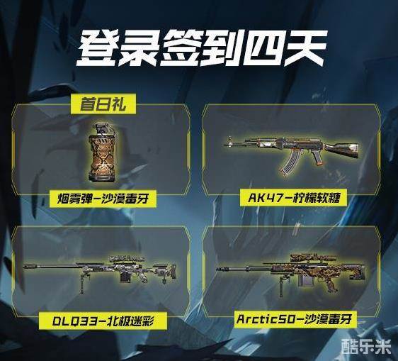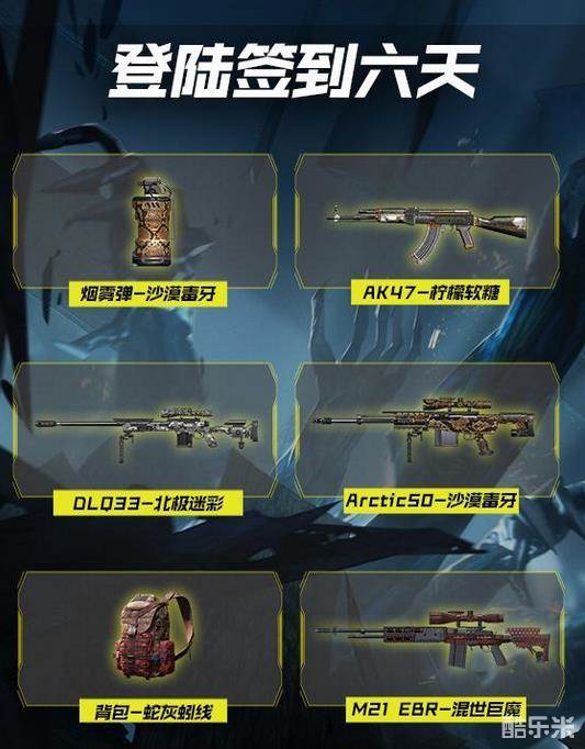 烟雾弹-沙漠毒牙、AK47-柠檬软糖、DLQ33-北极迷彩、Arctic50-沙漠毒牙、背包-蛇灰蚓线、M21 EBR-混世巨魔等永久武器道具