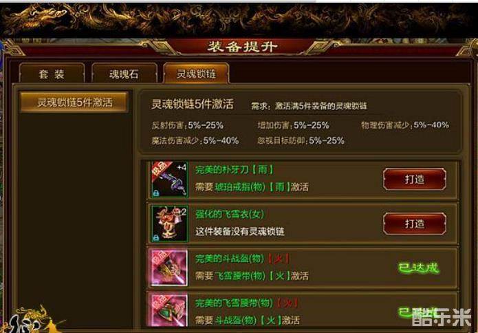 成功锻造出附带灵魂锁链的装备后,还需要锻造同类极品装备才能激活灵魂锁链能力。同样部位的极品装备,因装备后缀【火】、【雨】、【雷】等不同,需要的同类极品装备也不同。