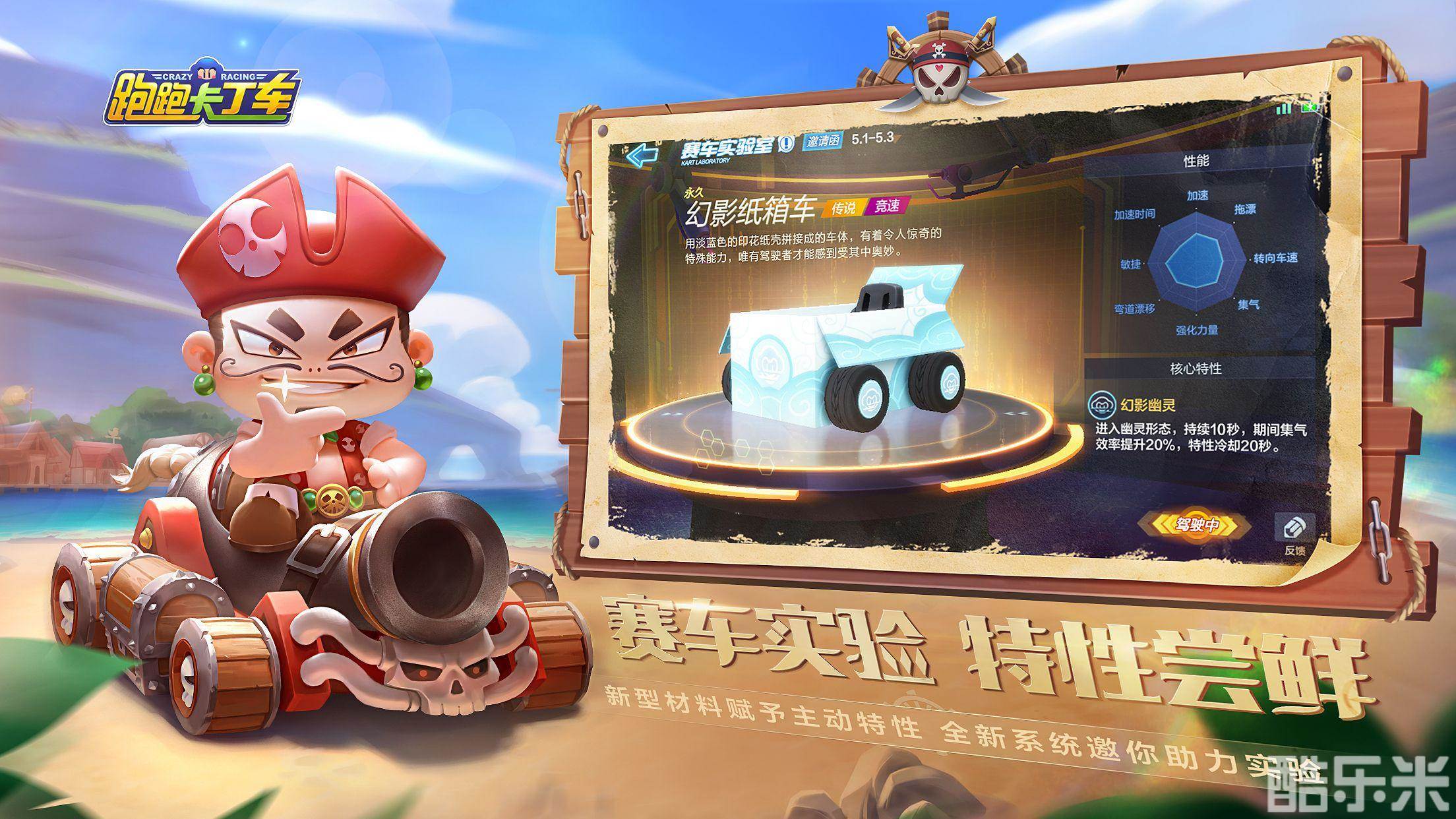 赛车实验室第一期推出的赛车为“幻影纸箱车”,它拥有主动特性“幻影幽灵”,使用特性后能够进入幽灵形态。在此形态下,车辆将不会与对手产生碰撞且集气效率提升。车友们可以在5.1-5.3日里在赛车实验室限时领取体验该车辆。