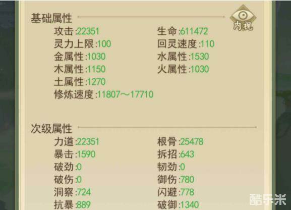 在获得内视能力之后,我们前往自身人物的属性面板,在基础属性的右上方就可以找到一个【内视】的按钮,点击它就可以直接查看自身的属性了。