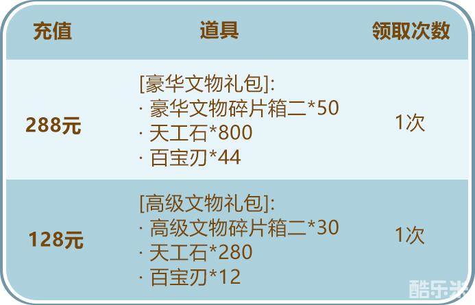少年们单笔充值指定金额,即可得到豪华文物碎片箱二、高级文物碎片箱二及丰厚的养成资源!少年们千万不要错过哟~