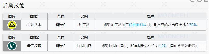这是与阿米娅、诗怀雅类似,但又生效点完全不同的新基建技能类型。两者分别是:2%的所有制造站生产力,7%的所有贸易站订单效率。